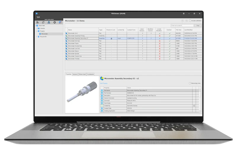 Alibre PDM on täielikult integreeritud andmehalduslahendus, mis hoiab sinu disainifailid struktureerituna. See sisaldab versioonihaldust, kasutuskohtade jälgimist, tagasikerimist, otsingutööriistu, rikkalikku metaandmestikku, varukoopiaid, mitut mitme kasutaja koostöö võimalust, kohalikku paigaldust ja palju muud.